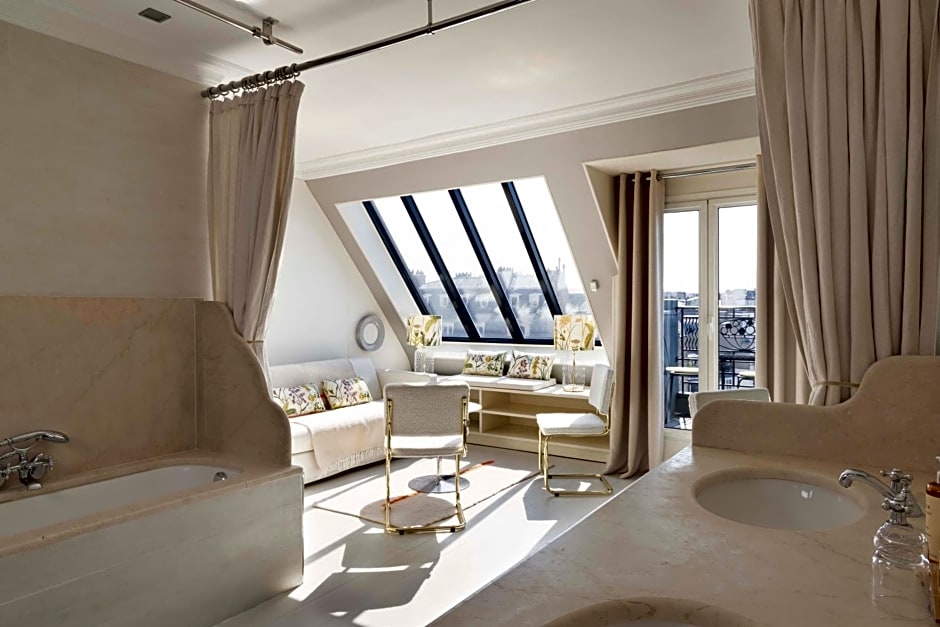 This bright and airy suite is on the top floor of the hotel and has a private balcony offering views of the Eiffel Tower and Arc de Triomphe.